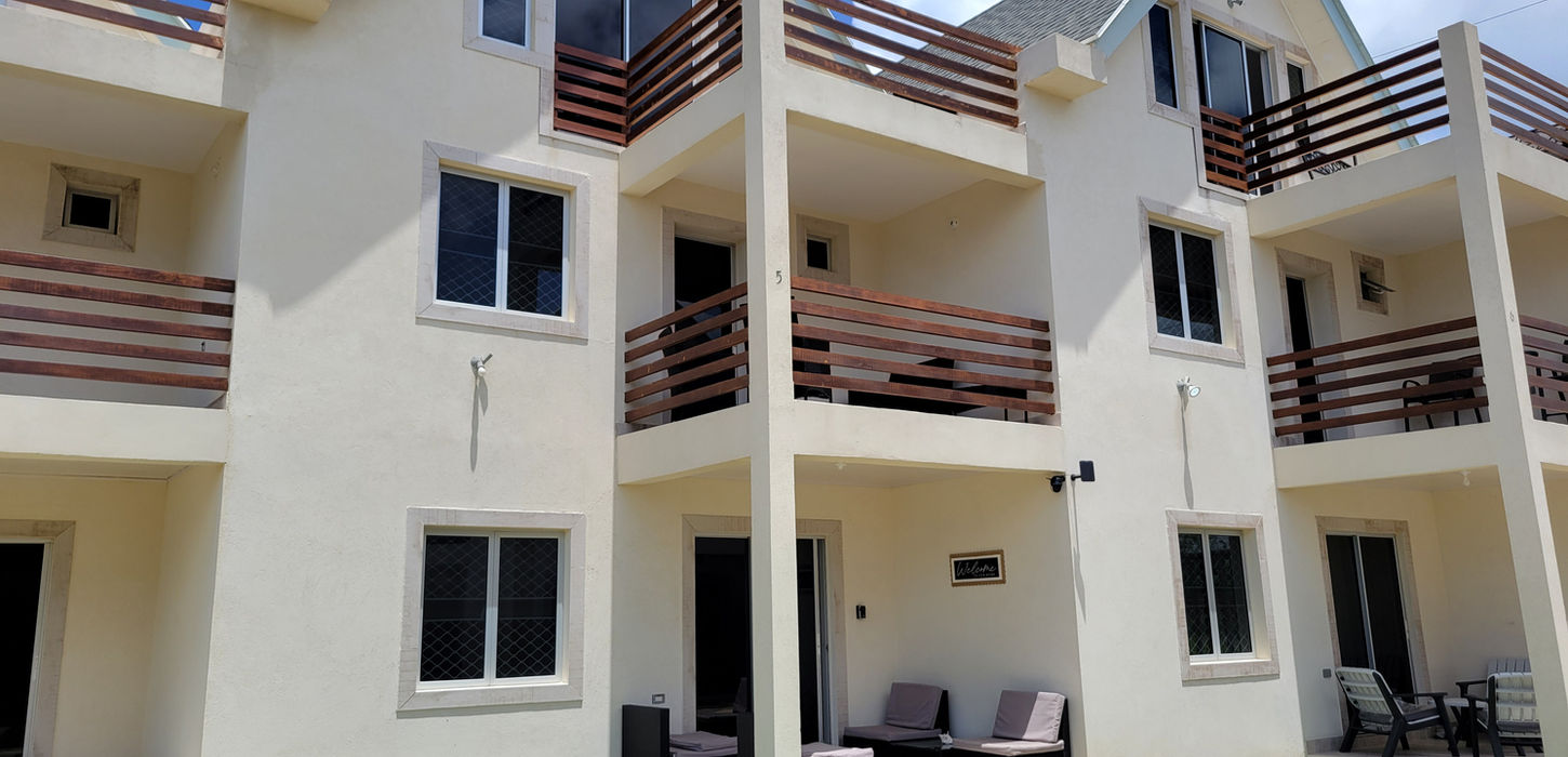 Lovely, modern apartment tucked away behind the airport runway. We rented two apartments in this complex (Atlantic on the Edge) for a large family gathering and had a wonderful time. The apartment can house 10 people comfortably and upto 14 if people share double beds. The location is great, with views over the Atlantic, but you will probably need a car to get around as the beaches, restaurants and bars in Crown Point are a bit far to walk.