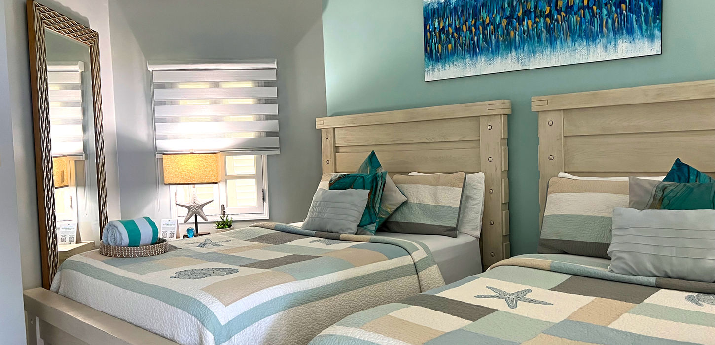 The Villa has a Master Suite with walk in closet and bathroom, a Guest Suite also has its own walk in closet and bathroom. In 2022 the owners created a new upper "Sky Loft" with the Sky loft's Guests having their own "rain" shower bathroom downstairs, that was recently created just with them in mind by the owners.