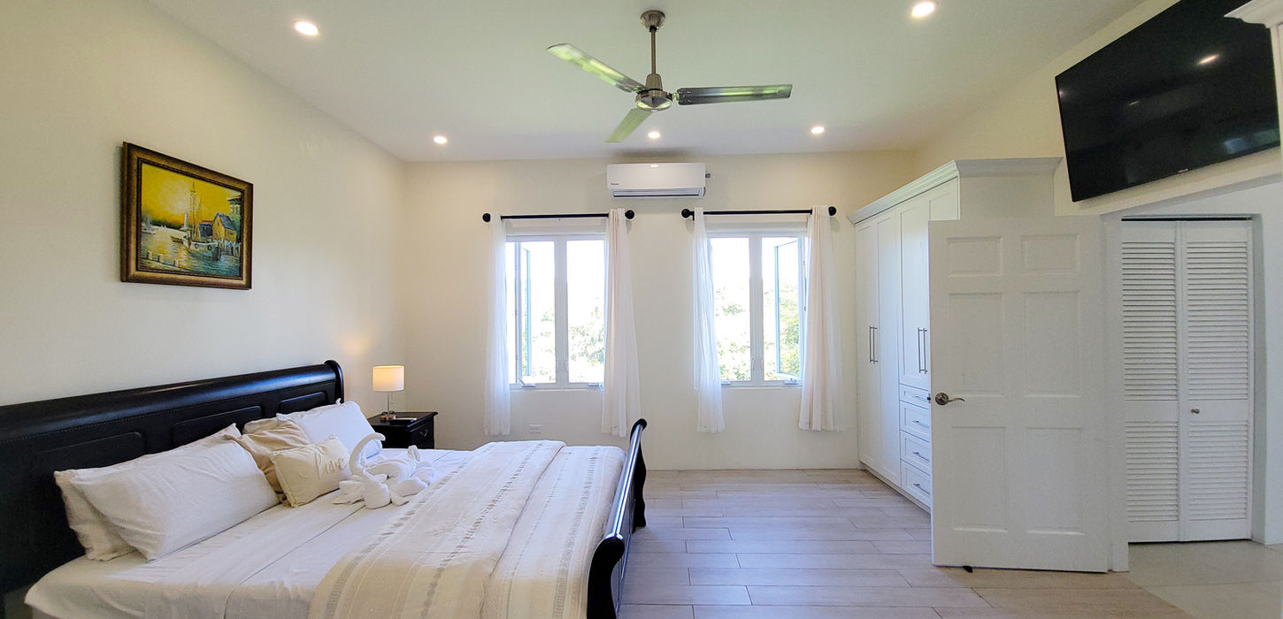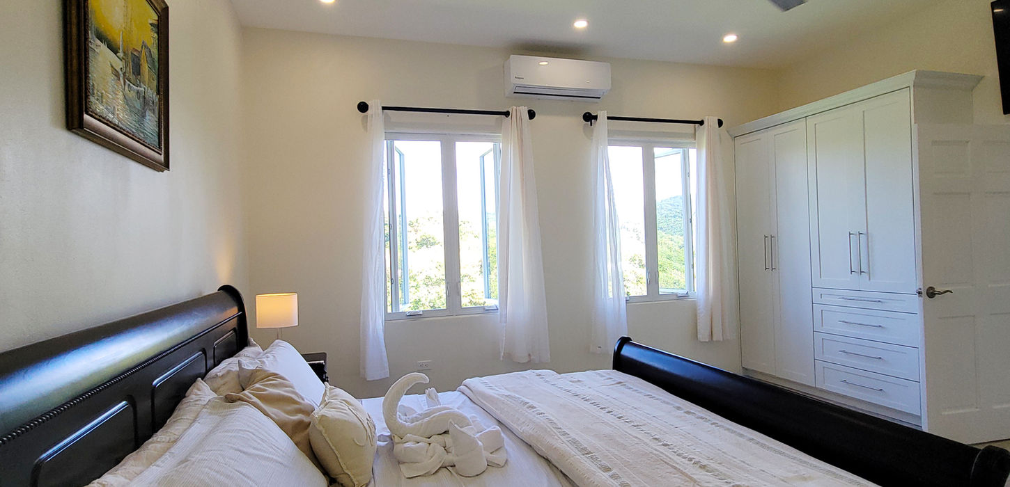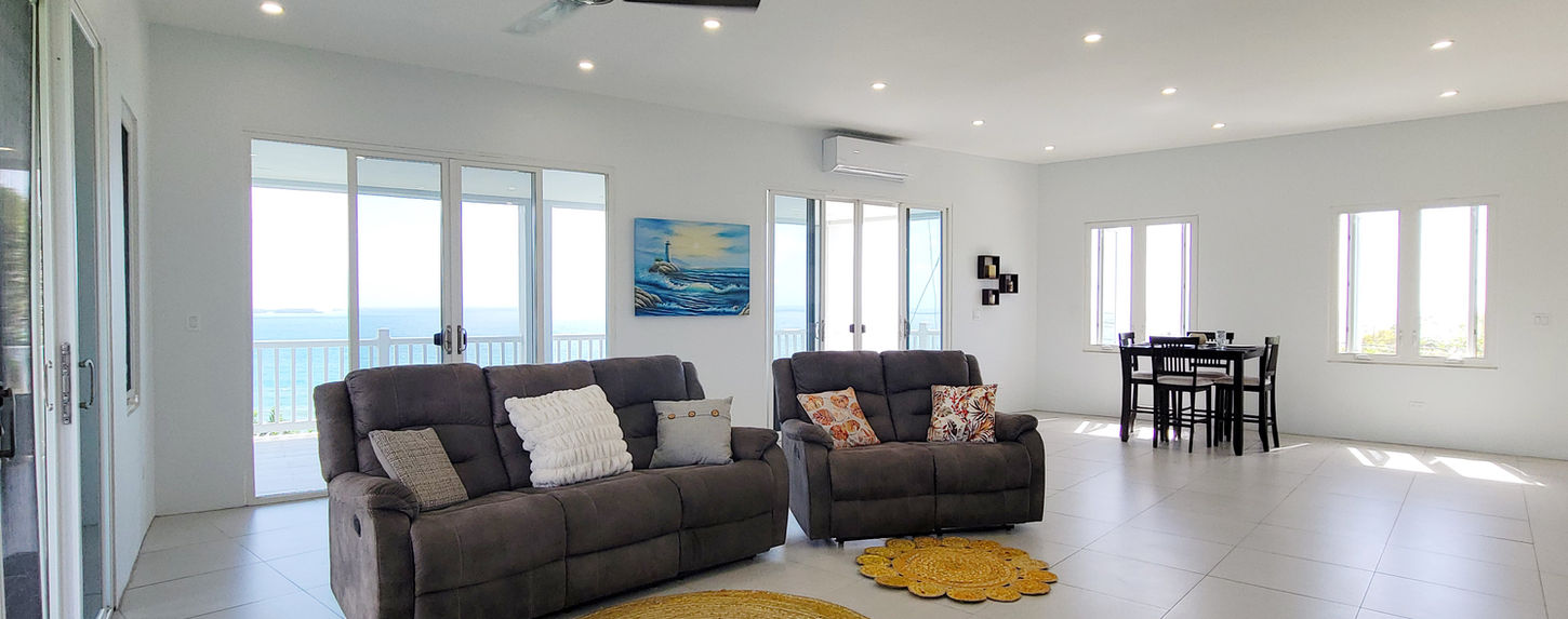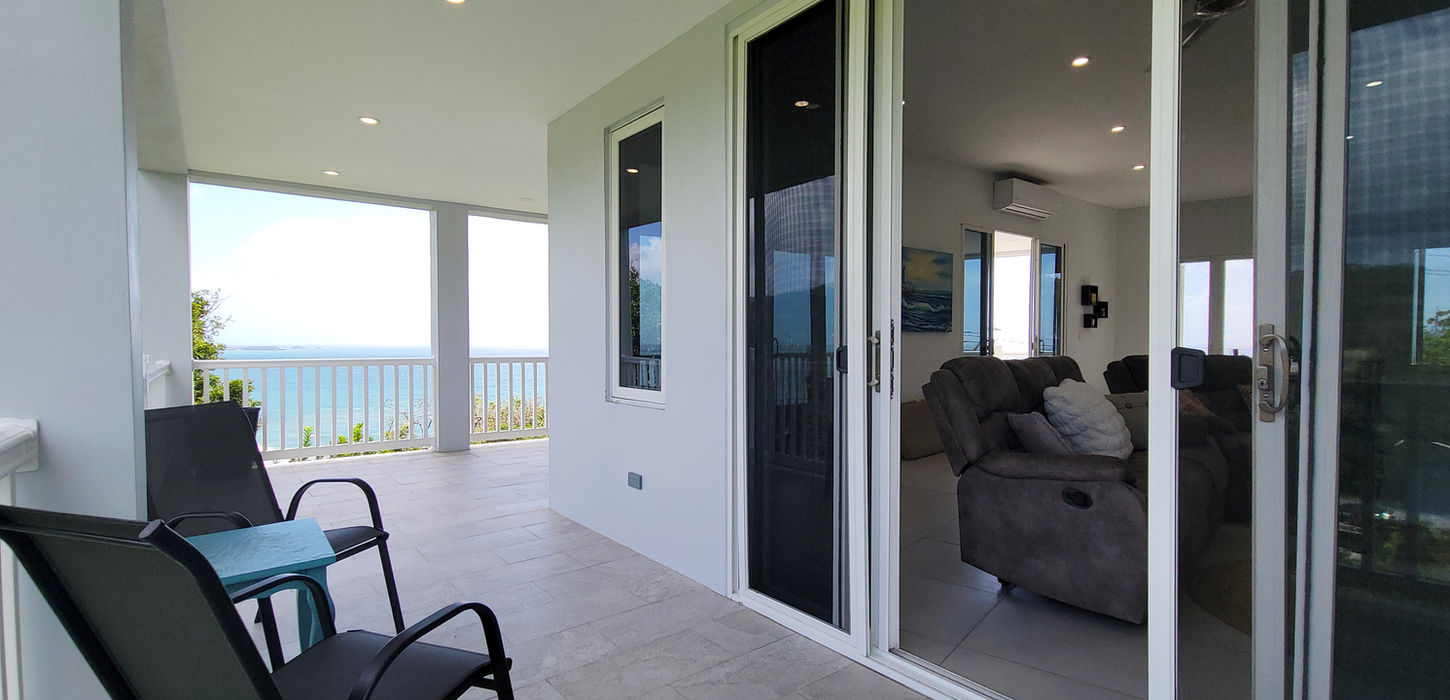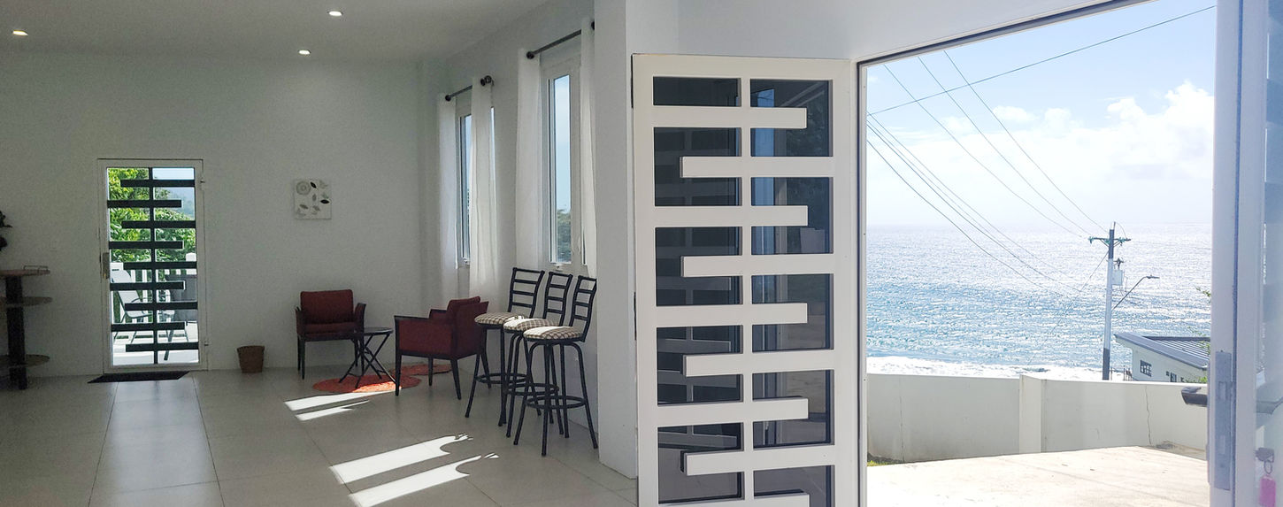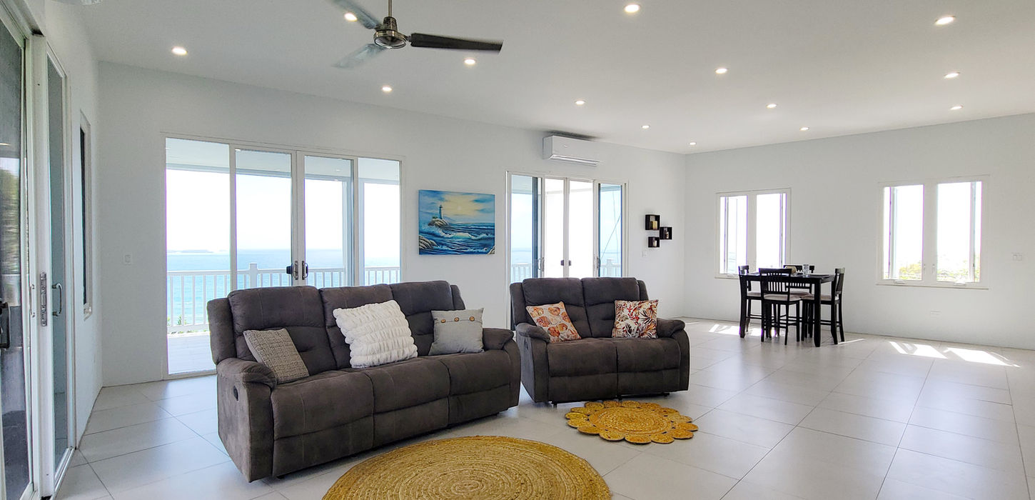 The villa features an open-concept living and dining area upstairs that flows into a fully equipped modern kitchen. Whether you’re preparing a casual breakfast or a shared evening meal, the space is designed for connection, comfort, and ease. Large windows and secured glass doors flood the interior with natural light while framing the ocean and mountain views.